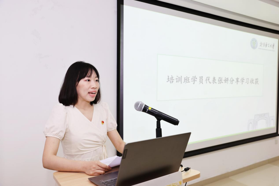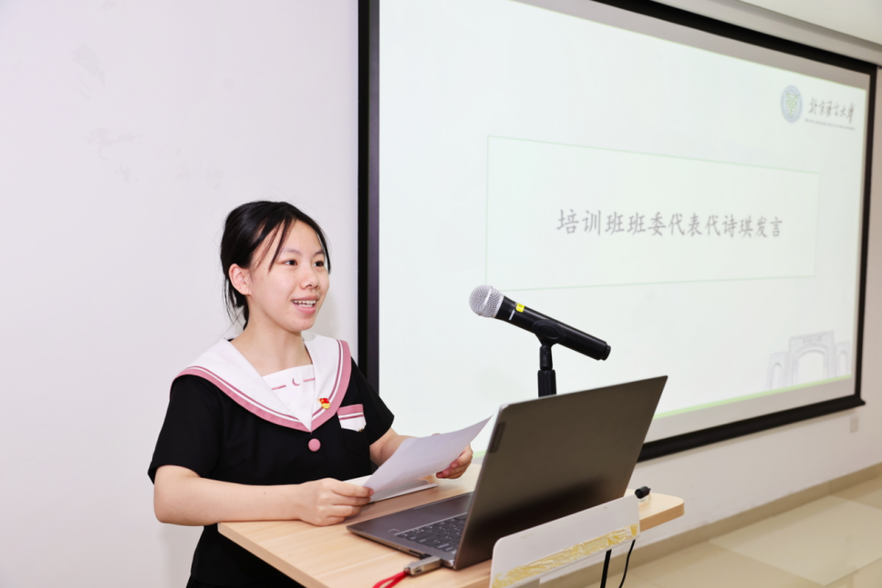 学员代表张妍同学分享了学习收获。她表示本次培训班内容丰富、形式多样。学员们在老师指导、帮助下用理论武装头脑、用脚步丈量世界,学思践悟、知行合一。在这个积极进取又充满活力的集体中,学员们充分体验到了学习、实践的收获与快乐,未来将无愧时代、不负人民,青春向党、勇立潮头,不断汲取精神力量、投入伟大事业!