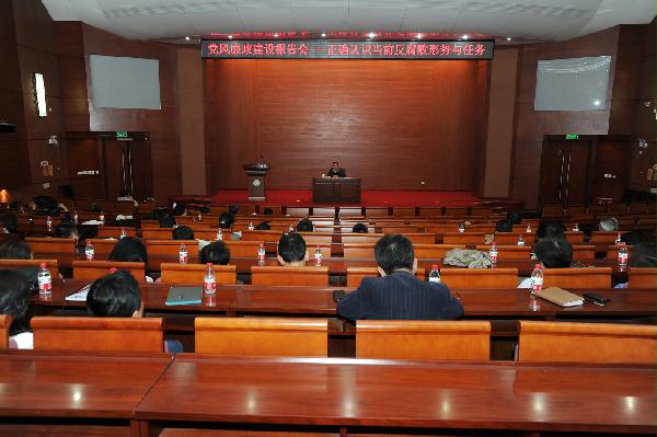 为进一步加强领导干部队伍建设,不断增强广大党员干部廉洁自律意识,5月7日下午,学校纪委和宣传部在逸夫楼报告厅召开党风廉政建设报告会,中央纪委宣教室副局级监察专员闫群力为全校党委中心组、处级理论中心组和分党委、直属党支部书记,做了题为《正确认识当前反腐败形势与任务》的报告。崔希亮校长、曹志耘副校长、王鲁新副书记等校领导参加报告会。刘伟副书记主持报告会。