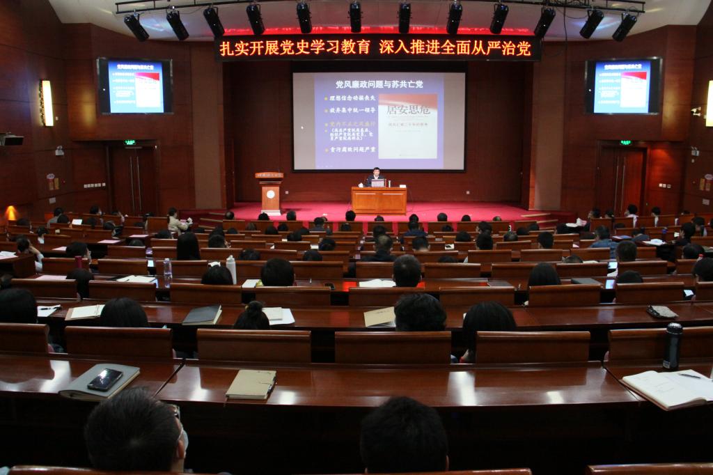 赵绪生教授报告的题目是“扎实开展党史学习教育,深入推进全面从严治党”。他围绕“为什么要坚持从严治党”和“如何推进全面从严治党”两个方面展开,从历史和现实、国际和国内多个维度,分析了贯彻全面从严治党方针的重大历史意义和新形势下管党治党面临的挑战。他从坚定不移推进依规治党、完善监督体系制约权力、抓住关键少数全面从严治党三个层面,阐释了习近平总书记全面从严治党战略思想,指出了推进全面从严治党纵深发展的方式方法。