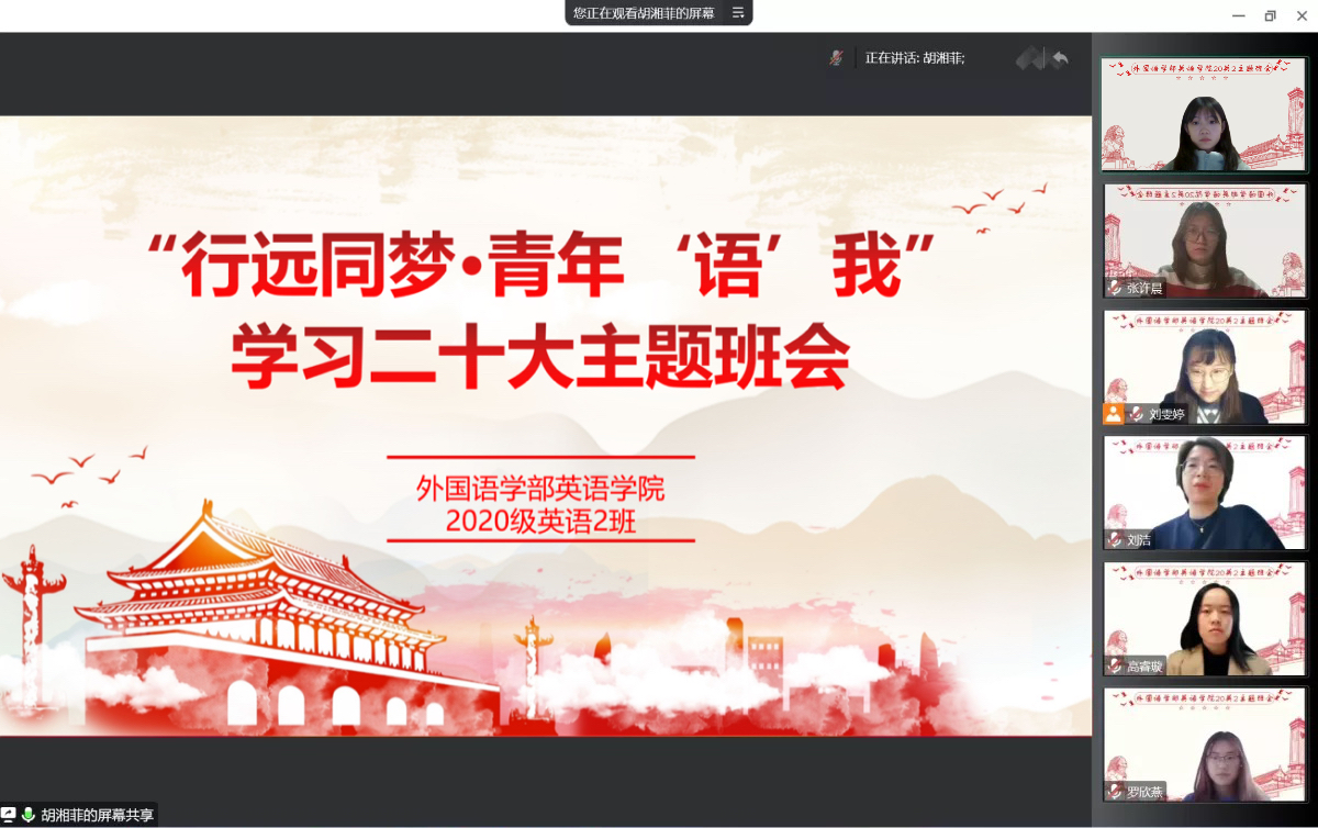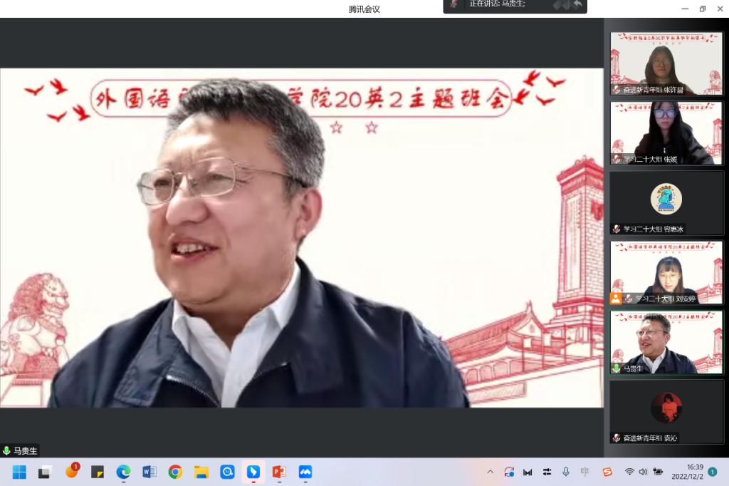 为进一步加强思想引领、打造班级良好氛围、号召广大同学深入学习党的二十大精神,12月2日,外国语学部英语学院20级英语2班举办了“行远同梦·青年‘语’我”学习二十大主题班会活动。校党委副书记、纪委书记马贵生老师,外国语学部党委书记罗林老师、党委副书记刘洁老师,外国语学部英语学院教师党支部书记、20级英语2班班主任张旭老师以及辅导员高睿璇老师参加了本次主题班会活动。会议在班长刘雯婷同学的主持下召开。