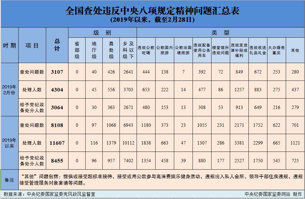 2019年以来,截至2月28日,全国查处违反中央八项规定精神问题8108起,处理11607人,给予党纪政务处分8455人。