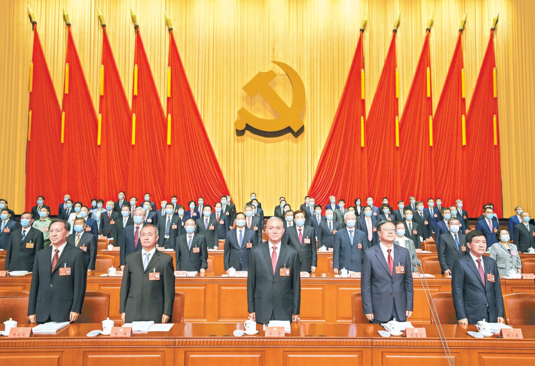 北京会议中心会议厅雄伟庄严、气氛热烈。主席台上方悬挂着镰刀和锤头组成的中国共产党党徽,10面鲜艳的红旗分列两侧。