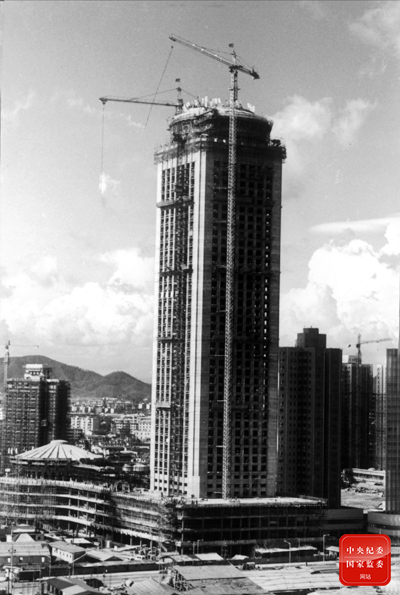 深圳国贸大厦采用工程公开招投标和创新滑模工艺,仅37个月就竣工,创造了中国建筑史上“三天一层楼”的纪录,被誉为“深圳速度”。图为80年代建设中的国贸大厦。