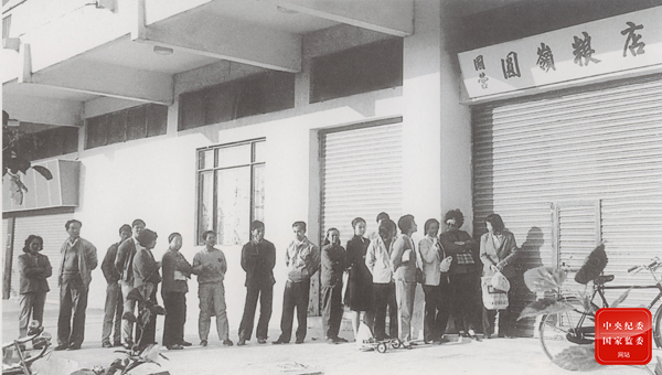 1984年11月,深圳经济特区(不含宝安县)取消粮、油、猪肉票证,实行议价、敞开供应,图为粮价放开后,人们在粮店外等候购粮。