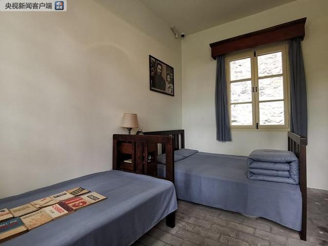 会客厅西侧是卧室,里面一张木质的床占了大半个屋子。床比普通的床稍大,沿着墙壁的床边整齐地排列着一尺厚的书。床边立有衣架,上面挂着毛泽东嵌着补丁的中山装和衬裤,磨出洞的皮拖鞋放在床下。