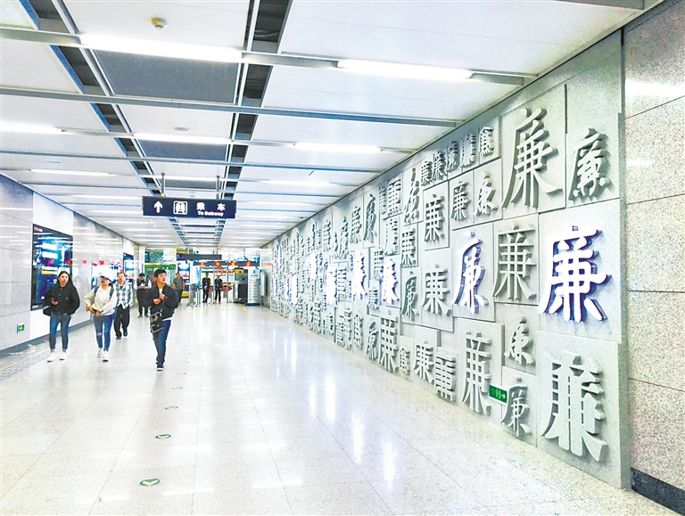 在北京市纪委监委指导下,北京市地铁公司建立了首座“清风北京”廉洁文化主题车站——六里桥站。图为由百余种字体“廉”字组成的“廉字墙”。 (图片来源:人民视觉)