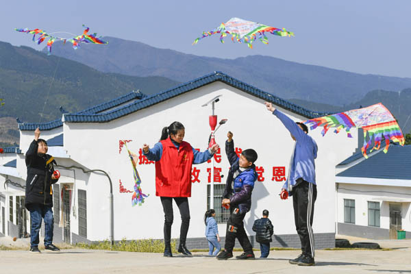 党的十八大以来,我们党把脱贫攻坚摆在治国理政的突出位置,组织开展了声势浩大的脱贫攻坚人民战争。数百万扶贫干部倾力奉献、苦干实干,同贫困群众想在一起、过在一起、干在一起,使脱贫地区整体面貌发生历史性巨变。图为近日,在湖南省永州市道县横岭瑶族乡浪石村易地扶贫搬迁安置区,孩子们开心地放风筝。(图片来源:视觉中国)