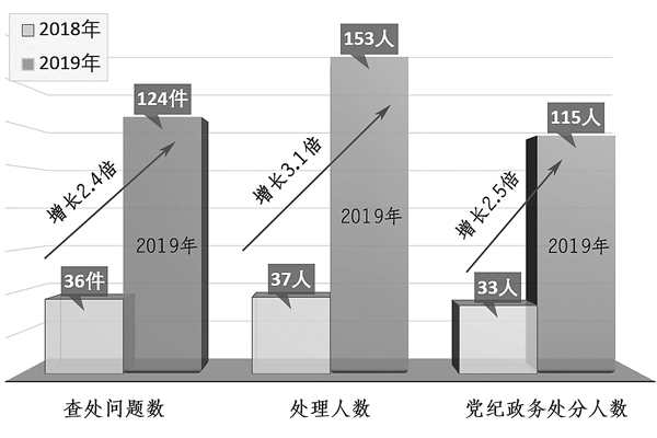 2019年,贵州省贵阳市纪检监察机关全力保障脱贫攻坚决战决胜,集中整治群众反映强烈的形式主义官僚主义问题,查处问题124起,处理干部153人,给予党纪政务处分115人,与上年查处数据相比,查处问题数、处理干部人数、党纪政务处分人数分别增长2.4倍、3.1倍、2.5倍,充分体现了坚持从讲政治高度整治形式主义官僚主义的力度和决心。(见图1)