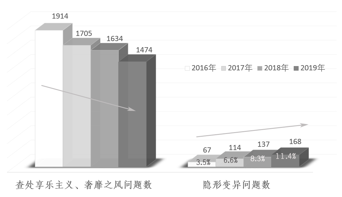 从近几年的工作实践看,党纪政务处分比例持续上升,凸显了越往后监督执纪越严的鲜明态度;违纪行为发生率逐年下降,干部作风持续向好发展。但从查处的隐形变异问题看,主要集中在享乐主义、奢靡之风中,在查处问题总数持续下降的情况下,隐形变异问题数量和占比却呈逐年上升趋势。2016年至2019年,全省查处享乐主义、奢靡之风问题总数从1914起逐年下降至1474起,而其中隐形变异问题数的占比却从3.5%逐年上升至11.4%。