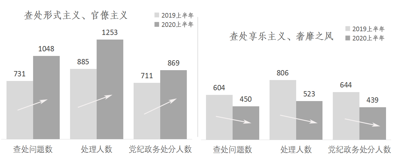 2020年上半年,贵州省共查处形式主义、官僚主义问题1048起,处理1253人,党纪政务处分869人,比2019年同期分别增长43.4%、41.6%、22.2%;查处享乐主义、奢靡之风问题450起,处理523人,党纪政务处分439人,比2019年同期分别下降25.5%、35.1%、31.8%。
